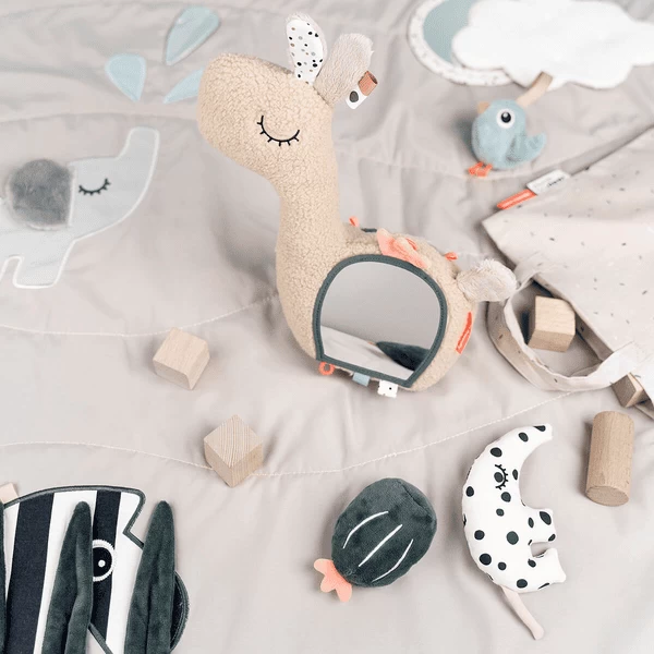 U kunt de fopspeen of het favoriete speeltje van uw baby aan de elastische lus vastmaken met een Universal ring. Er zijn ook veel kleurrijke etiketten, tastbare texturen en knisperende en ritselende geluiden te ontdekken op de spiegel op de vloer.