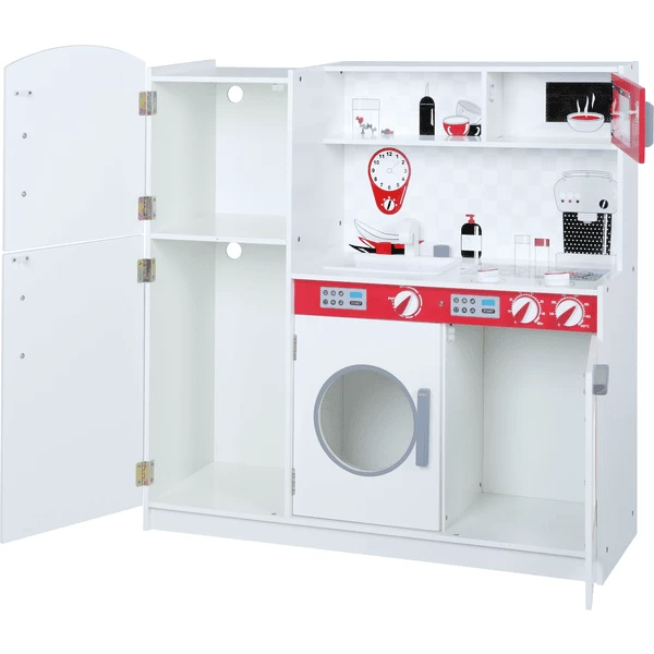 De kinderkeuken heeft een fornuis met 2 bedrukte kookplaten, een oven met deur, een wasmachine om te openen, een vriezer of koelkast met 2 deuren en beschrijfbaar bord, een magnetron en een gootsteen met waterkraan, evenals 2 decoratieve knoppen. De 5 draaiende knoppen voor de kookplaten, wasmachine en oven, evenals het transparante venster van de keukenapparaten beloven realistisch spelplezier. De ruime koelkast biedt veel opbergruimte, bijvoorbeeld voor boodschappen. Als alternatief kan het bovenvak in plaats van een vriezer ook worden gebruikt als opbergvak voor borden, potten of bestek. Het vak in het bovenste gedeelte van het keukenblok dient ook als opbergruimte voor alledaags keukengerei. De lieflijke opdruk met bedieningsknoppen, klok, koffiezetapparaat, ijsblokjesdispenser en vele andere keukenaccessoires maakt de roba keuken een blikvanger en inspireert kinderen vanaf het eerste moment.