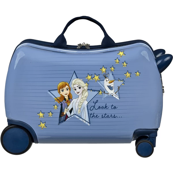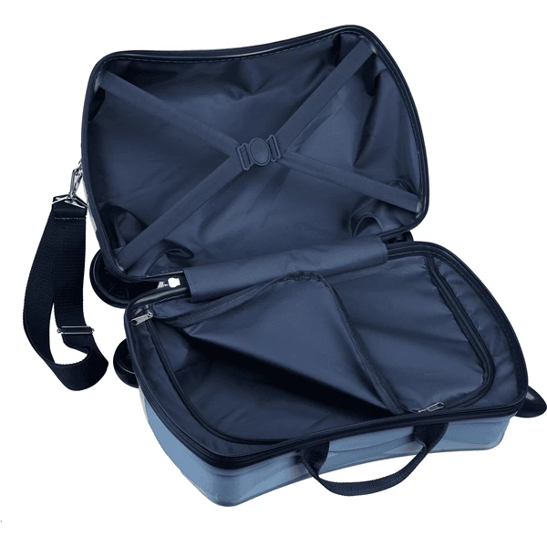 De kinderen kunnen op het wagentje zitten, zich aan de handgrepen vasthouden en het tijdens de wachttijd als schuifwagentje gebruiken. De twee 360° wielen maken de trolley bijzonder flexibel en garanderen glijplezier aan alle kanten. Bovendien biedt de trolley veel ruimte voor speelgoed en andere reisbenodigdheden dankzij de praktische indeling met ritsvak en dwarsbanden. De trolley kan comfortabel worden gedragen met de afneembare schouderriem. Bovendien kan de koffer als handbagage worden meegenomen.