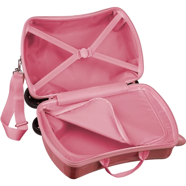 De kinderen kunnen op het wagentje zitten, zich aan de handgrepen vasthouden en het tijdens de wachttijd als schuifwagentje gebruiken. De twee 360° wielen maken de trolley bijzonder flexibel en garanderen glijplezier aan alle kanten. Bovendien biedt de trolley veel ruimte voor speelgoed en andere reisbenodigdheden dankzij de praktische indeling met ritsvak en dwarsbanden. De trolley kan comfortabel worden gedragen met de afneembare schouderriem. De koffer kan ook als handbagage worden meegenomen.