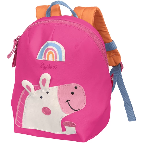 Door zijn formaat is de roze rugzak met de orange gekleurde riempjes al perfect geschikt voor peuters vanaf 2 jaar. Het geappliqueerde paard en de regenboog zijn echte blikvangers en doen meisjesharten sneller slaan. Of het nu voor de crèche, kleuterschool of familie uitje is – de modern e rugzak is altijd de ideale metgezel. Ondanks zijn compacte formaat biedt hij voldoende ruimte voor een lunchtrommel en een waterfles.