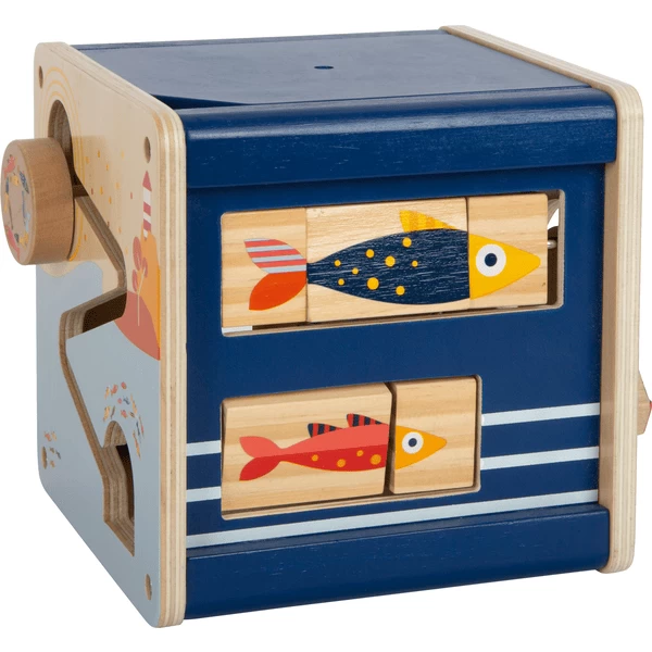 - Met twee motorieklussen, een vormenspel, een glijdend doolhof en een draaiend flappenspel op vijf speelbare oppervlakken is deze maritieme motoriekkubus van stevig hout een allrounder als het gaat om spelen, leren en ontdekken.