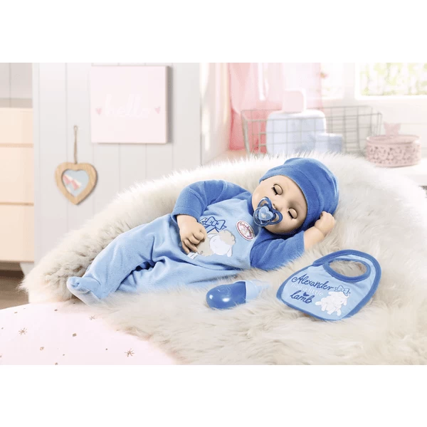 Alexander is een echte flessenbaby en zuigt op zijn blauwe fles met mondbewegingen en drinkgeluiden. Als het voeden niet snel genoeg gaat, vloeien er echte poppentranen en huilt Alexander hartverwarmend. Maar hij komt snel weer tot rust met allerlei activiteiten. Zijn favoriete bezigheid is om “hop, hop, hop” te spelen en vrolijk te lachen.